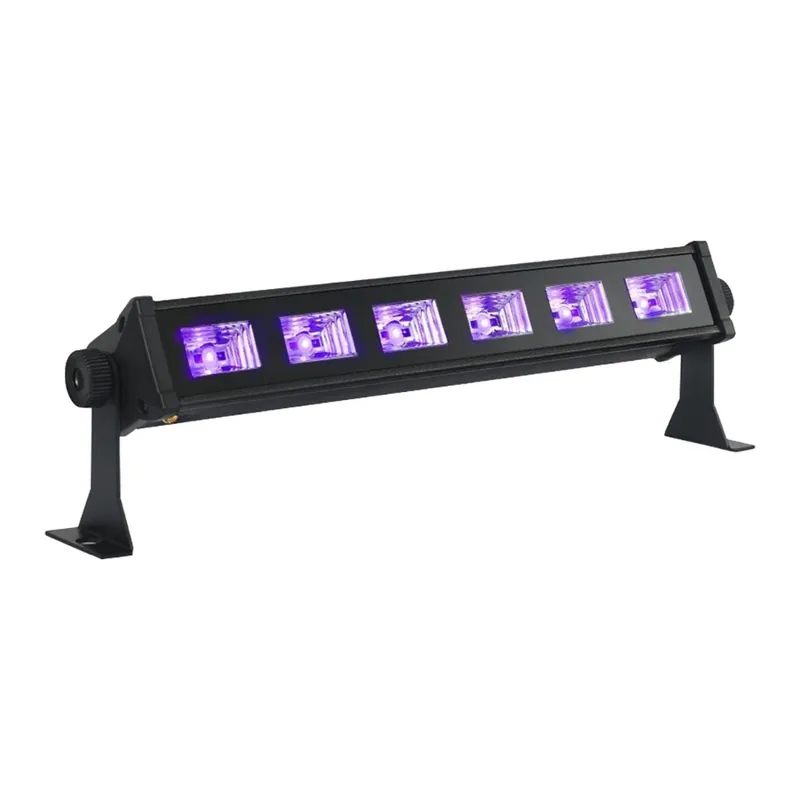 - Con 6 potentes LED UV de 3W cada uno, esta barra proyecta una luz negra que realza el brillo y los colores fluorescentes en telas blancas y pinturas corporales, creando efectos impactantes y llamativos.