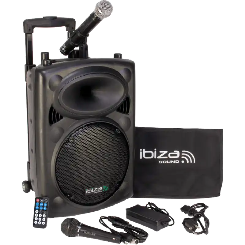 El altavoz Portátil 10 Pulgadas IBIZA SOUND PORT10VHF-BT de 250 W con funda protectora incluida es un sistema de sonorización Portátil con USB,MP3, BLUETOOTH y dos Micrófonos incluidos.