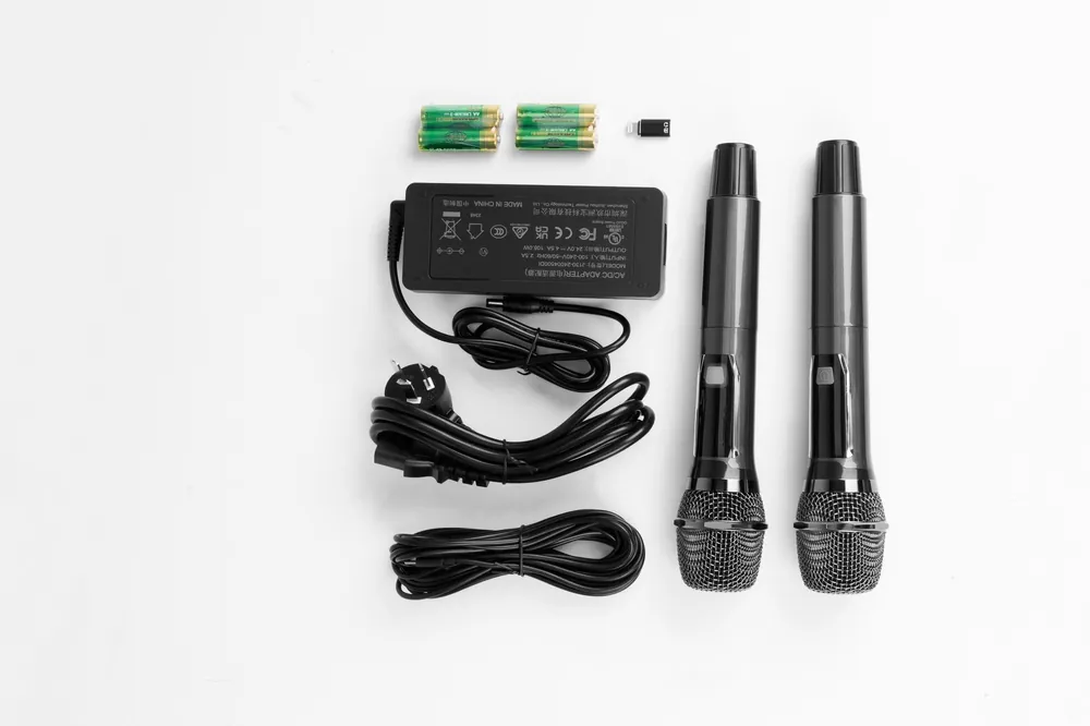 El sistema incluye dos micrófonos inalámbricos de mano que operan en la frecuencia UHF (600-700 MHz), asegurando una señal potente y estable.