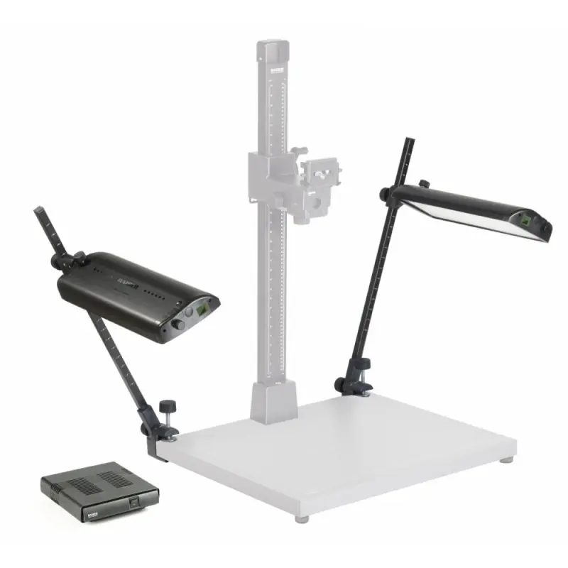 Carcasas de las lámparas de robusto perfil de aluminio anodizado, orientables, desplazables y regulables en altura. Pantallas blandas desmontables. Brazos verticales con marcas de altura, inclinables. Montados con robustas bases de pinza de aluminio fundido, anchura de pinza de hasta 48 mm (1,9 pulg.). Se suministra con adaptador de red.