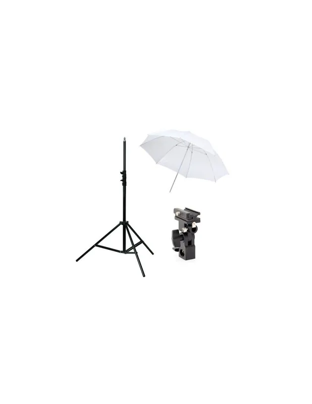 Kit de estudio para flashes compactos compuesto por un pie de estudio de 2,60 metros con muelles de retención, un paraguas traslúcido de 84 cm y un soporte para flash y paraguas tipo B.