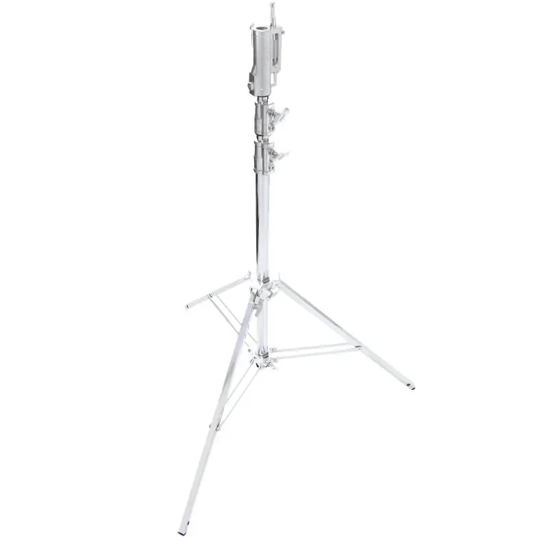 El stand de Kupo Master Cine Kupo 542M tiene una sólida construcción de acero y una capacidad de carga máxima de 40 Kg. También cuenta con el cabezal combinado universal de triple función con receptores de 28 mm y 16 mm más un perno multidireccional de 16 mm para aceptar cualquier tipo de desafío de montaje. Está equipado con una pata niveladora para extender una pata más que las otras para nivelar el soporte en un terreno inclinado o irregular. La altura máxima es de 3,5 m de altura sobre el suelo.