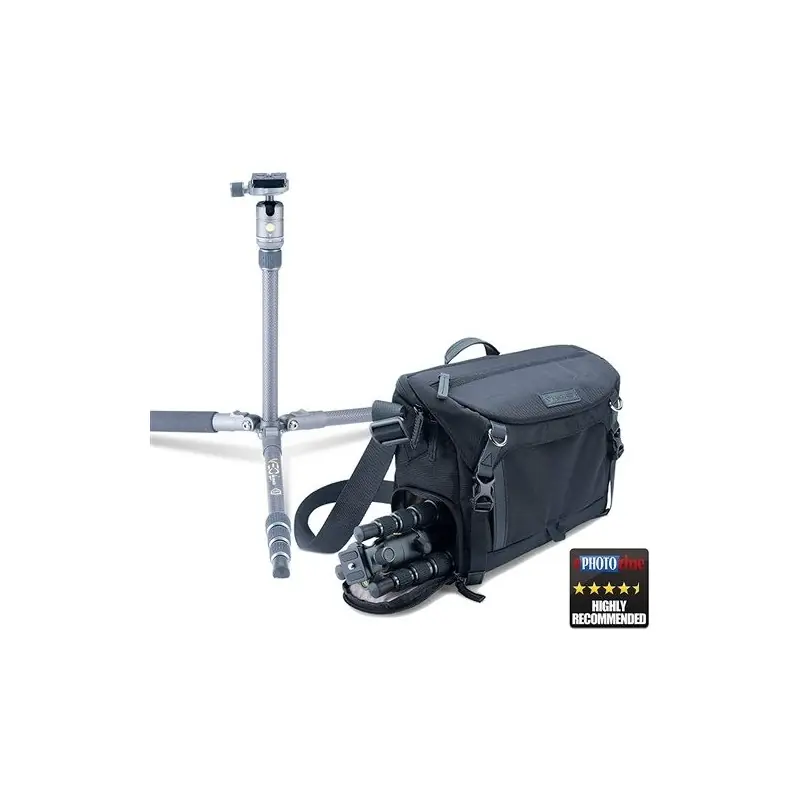 VEO 2 GO 204CB KIT incluye un trípode de fibra de carbono, compacto y ligero de 20mm, 4 secciones con una rótula de bola compacta optimizada para soportar cargas de hasta 3kg y una bolsa messenger VEO GO 34M con un compartimento para trípode incorporado.