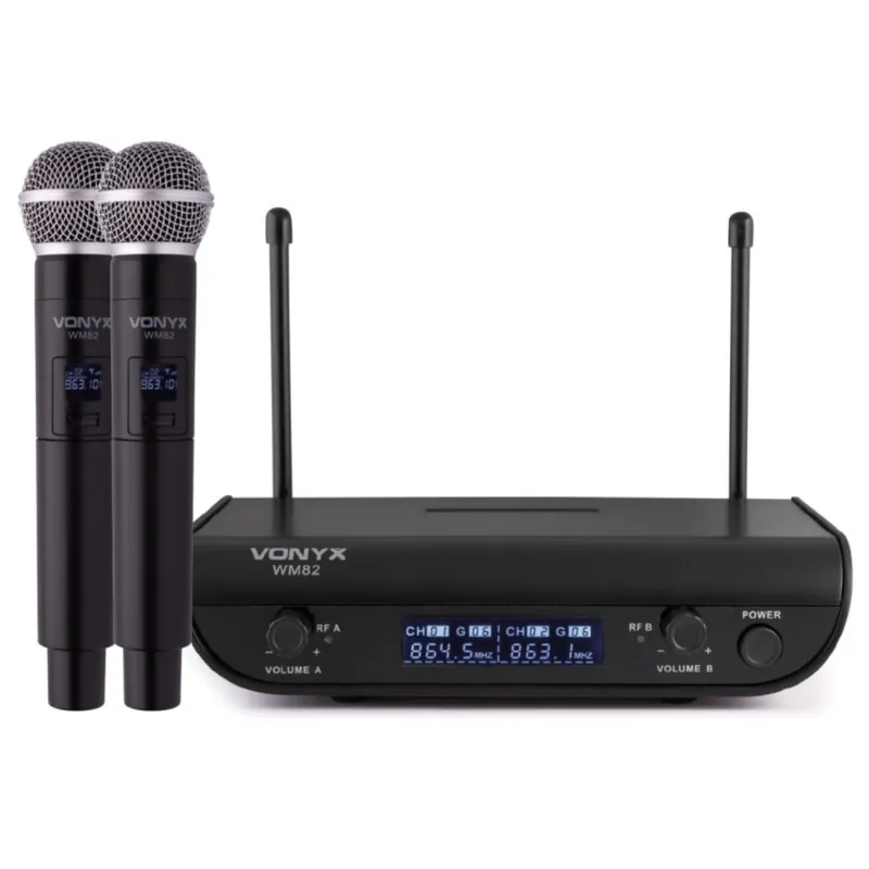 Sistema de microfonía inalámbrica fabricado por Vonyx formado por dos micrófonos de mano UHF que son capaces de trabajar en un rango de hasta 50 metros sin problemas.
