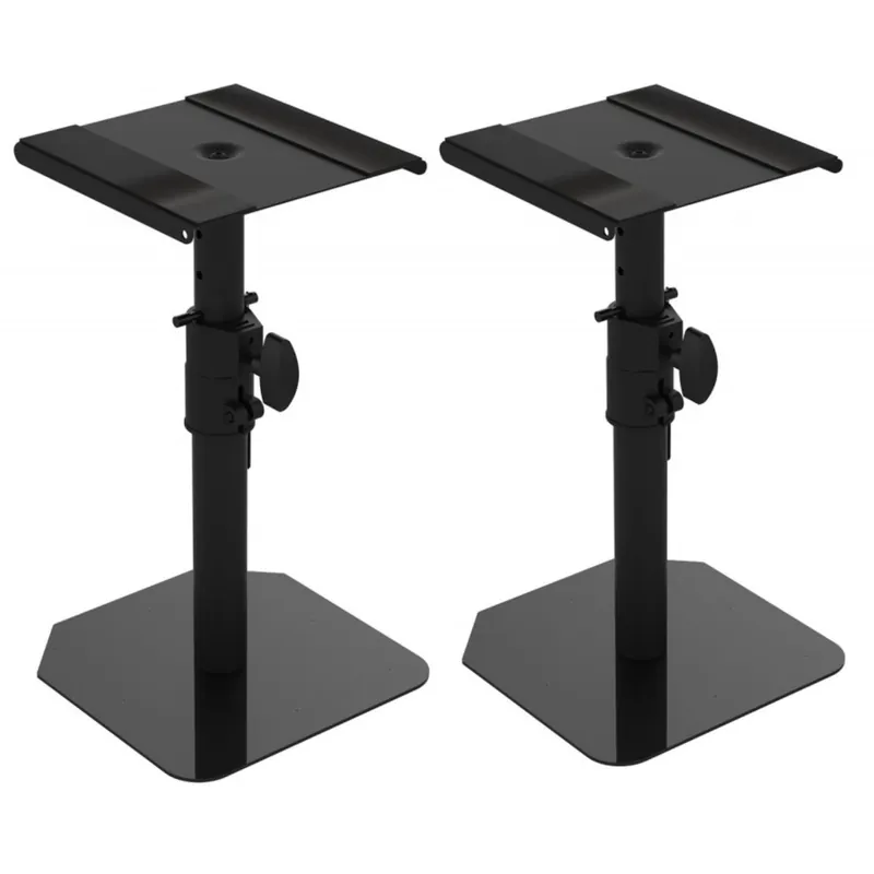 Soportes para monitores de estudio de hasta 8 pulgadas fabricado por Vonyx, con altura variable desde los 34 cm hasta los 49cm, dispone de tiras de goma para evitar desplazamientos del monitor y 8 cápsulas anti-vibración.