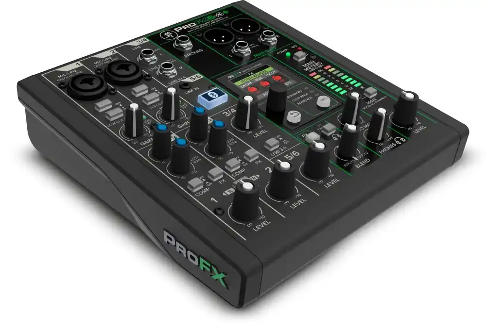 Mackie ProFX6v3+ es un mezclador analógico profesional de 6 canales e interfaz de audio para grabación y streaming, que cuenta con preamplificadores Onyx y ecualizador, modos de grabación USB conmutables, Bluetooth® bidireccional y efectos GigFX+ mejorados que puedes ajustar en una pantalla LCD en color.