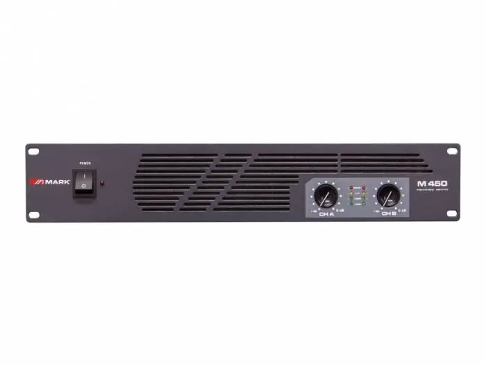 M 450 es un amplificador de audio profesional de 2 canales de 220 W @ 4 Ohm, construido en carcasa metálica de 2 unidades de rack. Cuenta con entradas balanceadas en formato XLR3 y jack TRS 1/4″ y salidas con conectores XLN4 y Binding Post. Dispone de interruptor de encendido, controles de volumen independiente para cada canal e indicadores de encendido, señal, clip y protección, además de conmutador de masa flotante.