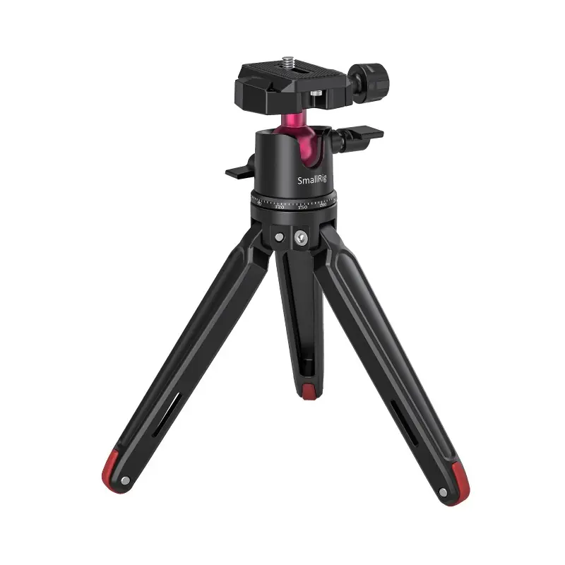 Mini trípode de mesa SmallRig con cabeza de bola panorámica BUT2664 es el mini trípode perfecto para DSLR compactas, cámaras sin espejo, teléfonos inteligentes, cámaras de acción y otros dispositivos, y también puede actuar como agarre para disparar de mano. El trípode sin cabeza de bola soporta hasta 20 kg, mientras que la cabeza de bola en sí aguanta hasta 2 kg. Es sólido y seguro, y los pies de goma garantizan una base estable y antideslizante en cualquier superficie. La cabeza de rótola con calibración precisa admite rotación panorámica de 360° para disparos panorámicos, inclinación frontal de -90°/+45° e inclinación lateral de -50°/+50° para el ajuste de ángulo múltiple, incluyendo disparo horizontal y vertical. Viene con una placa Arca-Swiss estándar, que es compatible con otras abrazaderas Arca-Swiss para garantizar un montaje/desmontaje rápido de su dispositivo.