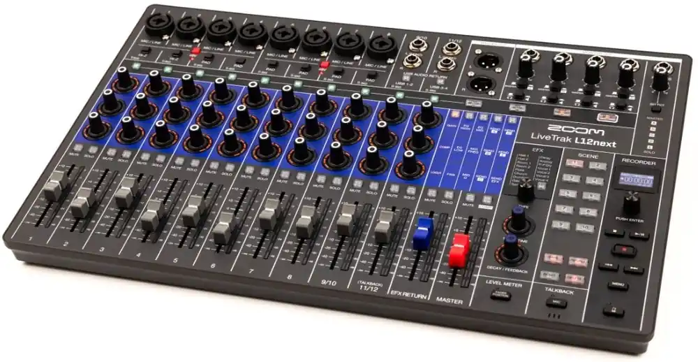 El Zoom LiveTrak L-12 Next es un equipo híbrido tres en uno diseñado para la producción de audio profesional con la comodidad y la inmediatez de lo analógico. Su diseño avanzado lo posiciona como la herramienta definitiva para grabaciones en vivo, ensayos y estudios caseros, integrando una mesa de mezclas, una grabadora multipista de alta resolución y una interfaz de audio.