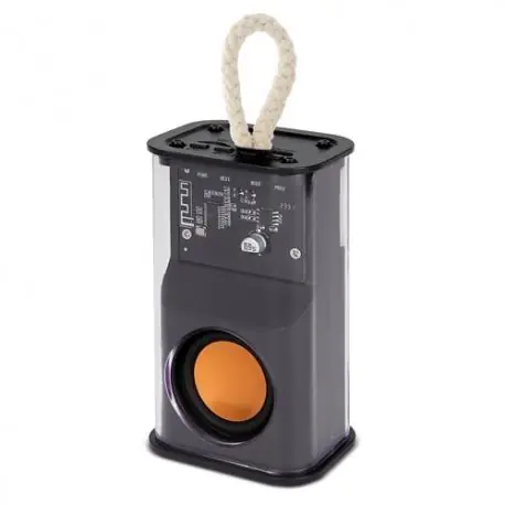 Original altavoz bluetooth con luz RGB que dará color a tu música y una gran potencia de graves. Un acabado único con carcasa rPet transparente y cordón de algodón para transportar Batería 500 mAh, incluye cable de carga Cada pieza en caja individual (medida 6,2×12,4×4,8 cm). mgrabacion: 45×20 mm