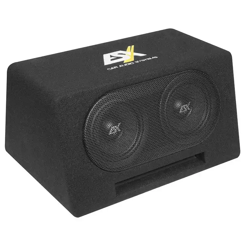 ESX Audio DBX206Q es una caja acústica compacta con doble subwoofer de 6″ de la línea DBX, con una potencia de 600 W, son cajas de tamaño reducido con forma trapezoidal, cuentan con rejillas protectoras para el altavoz.
