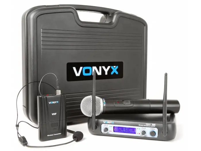 - Microfono de mano y transmisor de petaca que operan a distintas frecuencias VHF