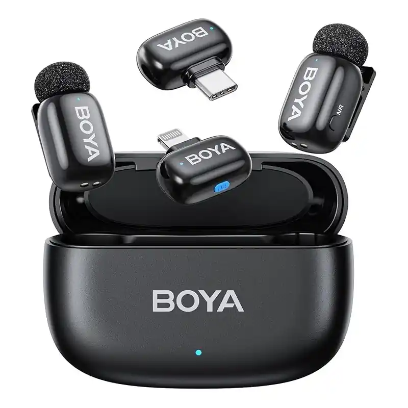 El BOYA Mini 2 está disponible con varios receptores (USB-C o Lightning) y funciona a la perfección con smartphones, tablets, portátiles y cámaras. El paquete incluye dos transmisores, un receptor, un estuche de carga, cables magnéticos y un práctico estuche de transporte para que puedas empezar a grabar de inmediato.