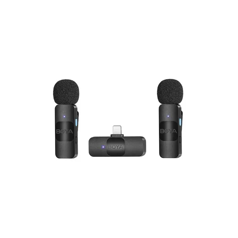 Boya BY-V2 Micrófono Inalámbrico Doble Ultra Compacto y Portable 2.4GHz Conector Lightning , El BY-V2 incluye dos transmisores y un receptor, el receptor viene con una salida Lightning con certificación MFi, diseñada específicamente para dispositivos iOS de Apple. Ofrece una solución de audio de alta calidad a un precio asequible, por lo que es accesible a una gama más amplia de usuarios.