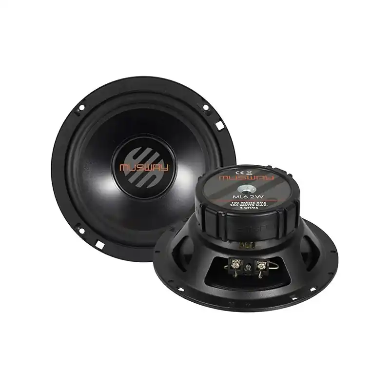 Los woofers de 6.5″ Musway ML 6.2W admiten una potencia de hasta 200 W. Este woofer tiene chasis de acero resistente, la bobina móvil es de 25 mm, está perfectamente refrigerada por ventilación trasera y la perforación del núcleo del imán, este imán es de 13 onzas y está protegido por una funda de goma, La membrana es de aluminio anodizado negro ultraligero, gracias a este material de alta calidad y especialmente ligero, el cono prácticamente no se deforma y alcanza un nivel de eficiencia muy alto.