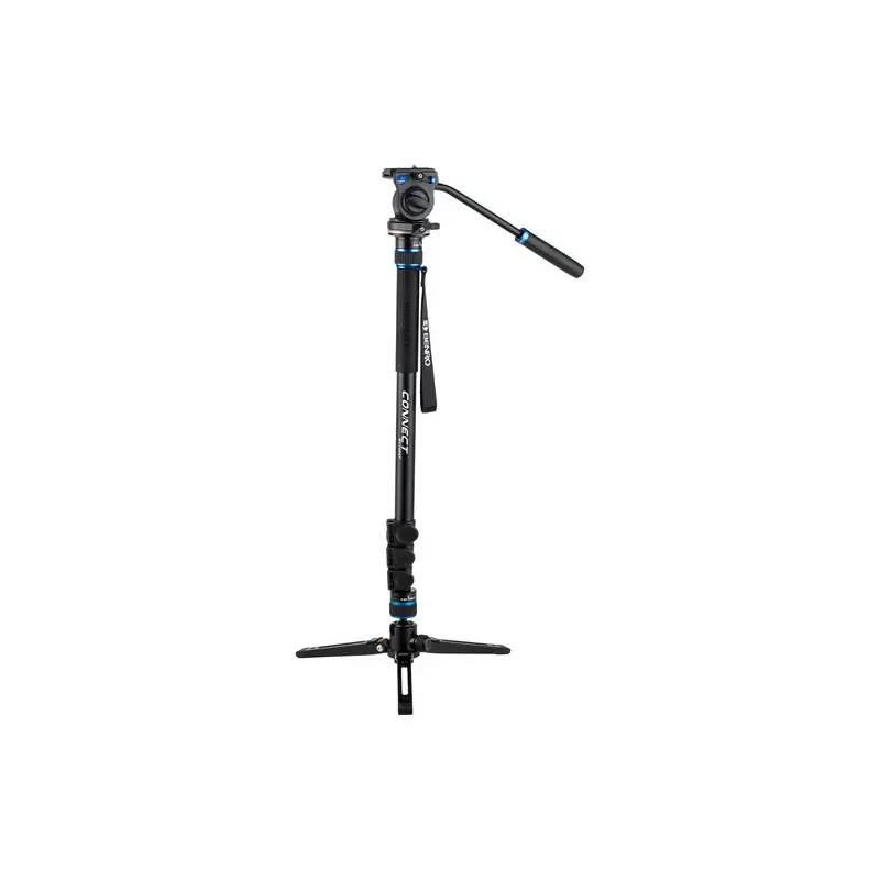 El monopie de video Benro Connect tiene una base de 3 patas que se convierte en un trípode de ángulo bajo, que permite que sea usado en espacios reducidos y en zonas de superficies pequeñas. La rótula que integra el kit podremos poner hasta 2 kilos de carga.