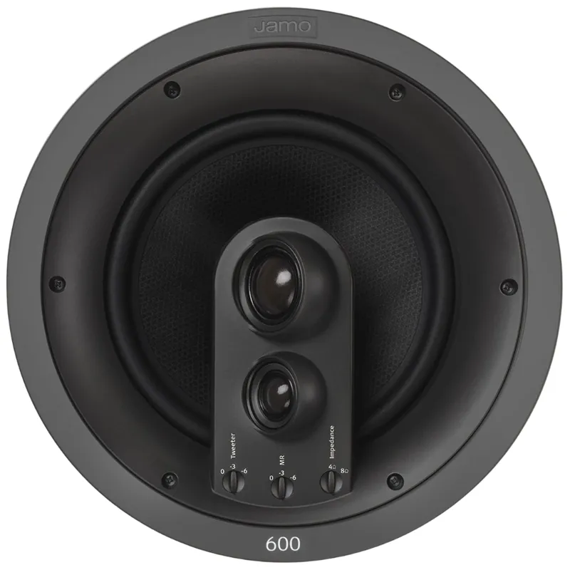 Su rejilla magnética pintable permite que el altavoz se integre de forma casi invisible en el techo, manteniendo la estética del entorno. El diseño del tweeter y rango medio angulados proporciona una excelente claridad y detalle para diálogos y efectos en películas. Además, cuenta con un selector de impedancia (4-8 ohmios) y atenuadores de medios y agudos (0, -3 dB, -6 dB) para una adaptación óptima al entorno auditivo.