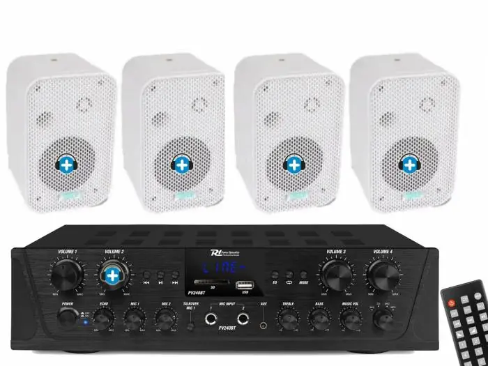 Equipo de sonido compuesto de amplificador de 4 zonas y 4 altavoces de 4 ohm. Pefercto para sonorizar en instalaciones tanto en interior como en pequeños exteriores o terrazas. Este equipo de Hilo musical dispone de con 4 zonas de control de volumen diferenciadas, te permite tener un control de volumen de cada altavoz. , un sonido con la misma musica o mensajes de voz, pero te permite tener 4 volumentes diferenciados, de una manera facil y sencilla desde el frontal del amplificador. Maximo control y con un montaje muy sencillo.