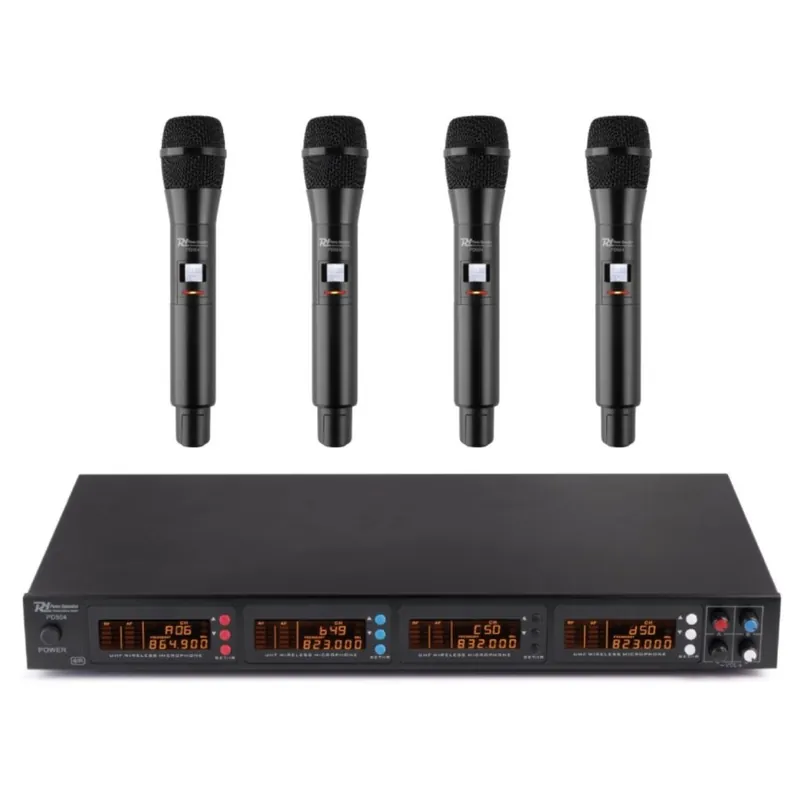 Sistema de microfonía inalámbrica fabricado por Power Dynamics con 4 micrófonos de mano UHF que pueden funcionar todos a la vez.