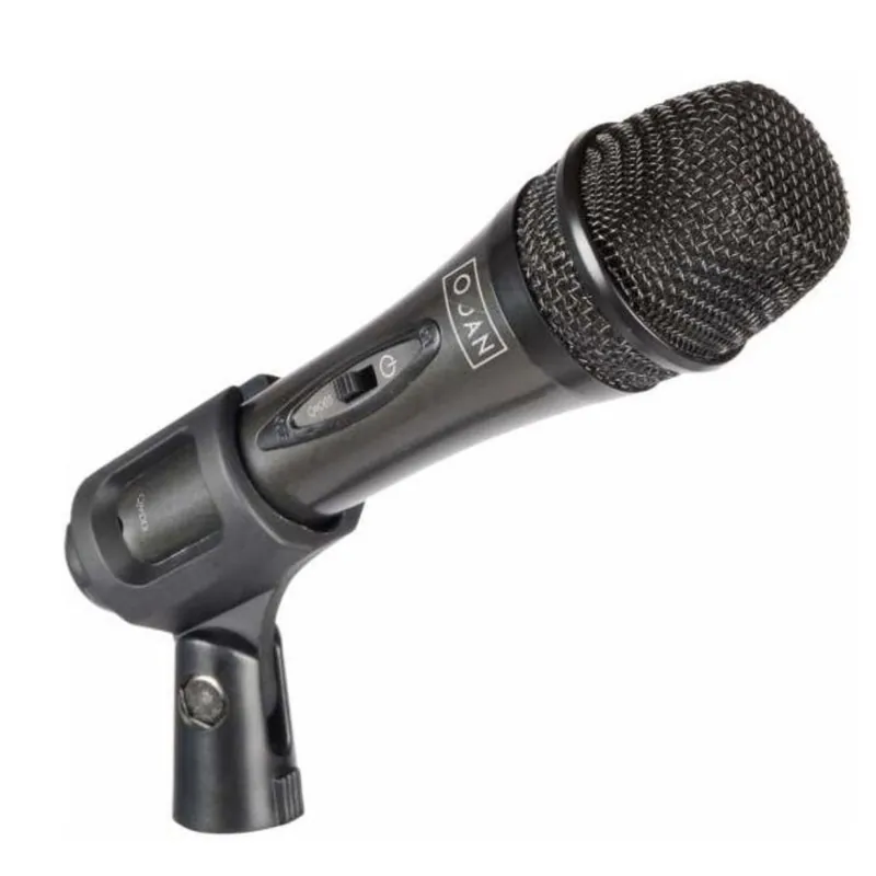 Micrófono dinámico para voz unidirecciónal con cuerpo de plástico robusto y rejilla negra metálica.