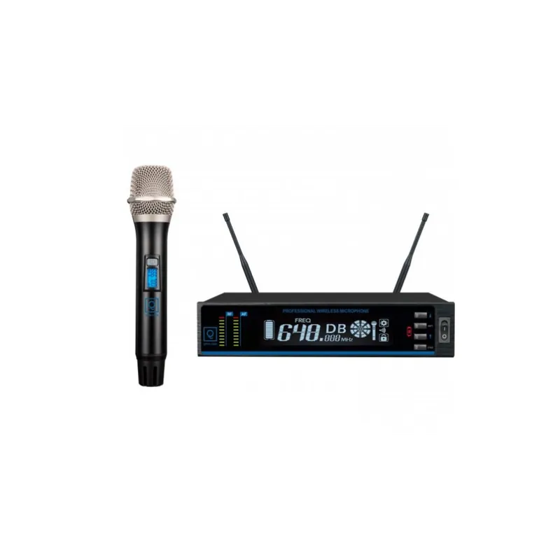 Sistema inalámbrico profesional UHF QWM-1SH de Oqan. Compuesto por un emisor de micro de mano y un receptor True diversity.