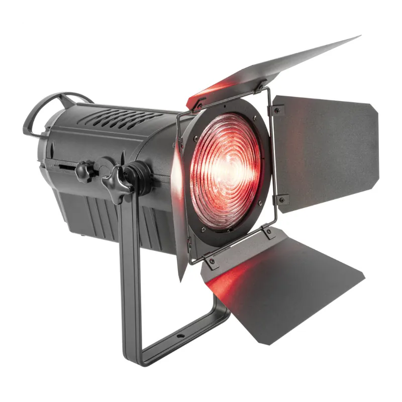 - Proyector fresnel de LED RGBW de 200W diseñado para teatros y escenarios.