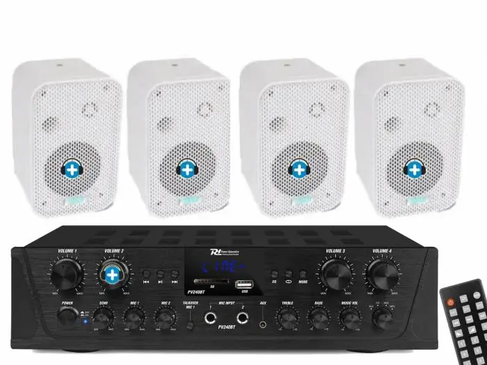 Equipo de sonido compuesto de amplificador de 4 zonas y 4 altavoces de 4 ohm. Pefercto para sonorizar en instalaciones tanto en interior como en pequeños exteriores o terrazas. Este equipo de Hilo musical dispone de con 4 zonas de control de volumen diferenciadas,  te permite tener un control de volumen de cada altavoz. , un sonido con la misma musica o mensajes de voz, pero te permite tener 4 volumentes diferenciados, de una manera facil y sencilla desde el frontal del amplificador. Maximo control y con un montaje muy sencillo.