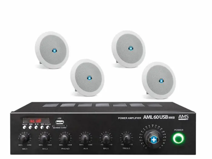Equipo de megafonia ideal para hilo musical de tiendas, comercios, y pequeños establecimientos. Equipo de megafonia compuesto de amplificador AML 60 USB MKII con entrada de USB y 2 entradas de micrófonos y 4 altavoces de instalación de techo.