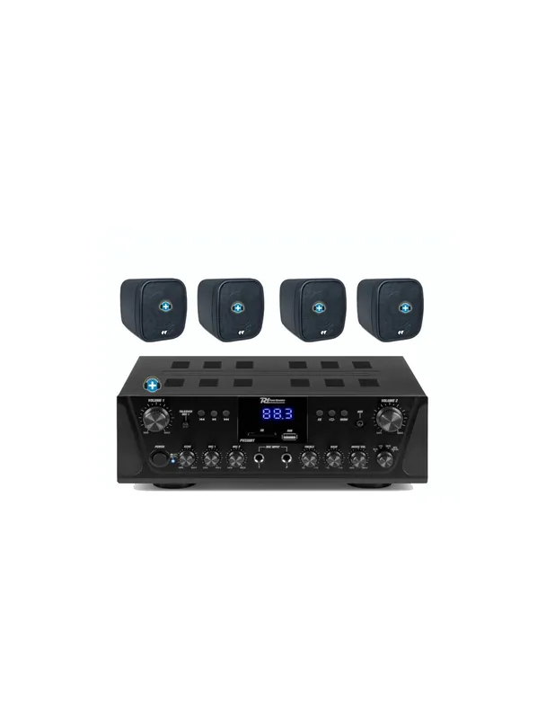 Pack de megafonía compuesto por 4 altavoces pequeños en color negro y un amplificador multimedia con bluetooth y lector de USB.