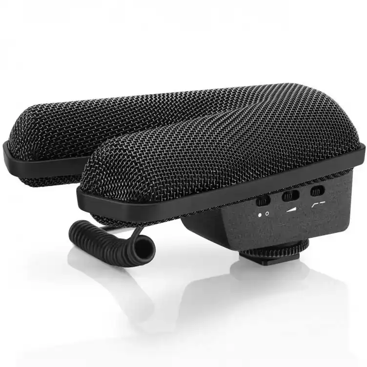 Nuestra solución es nuevo diseño patentado en forma de V de dos micrófonos de pistola. Esta configuración brinda una cobertura de amplitud estéreo equivalente a la imagen creada por los populares lentes de cámara de 35 mm. La dispersión es muy uniforme y brinda una alta inteligibilidad del discurso en su enfoque.