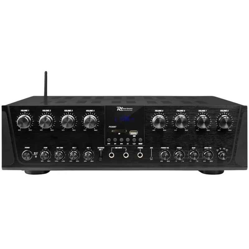 El PV280BT es un sistema todo-en-uno ideal para proyectos de instalación de audio donde se necesita controlar varias zonas con un solo amplificador. Este dispositivo tiene la capacidad de gestionar hasta 8 zonas con control independiente de volumen para cada una, permitiendo un control total sobre la salida de sonido en distintos espacios.