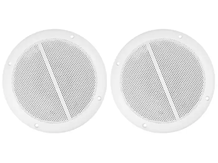 Conjunto de 2 altavoces resistentes al agua para panelar o colocar en techo. Su diseño resistente a elementos permite su uso con lluvia, salpicaduras y humedad (no sumergido). Tambien son resistentes a los rayos del sol UV por lo que no se rompen por exposicion prolongada. Ideal para barcos o uso en zonas humedas como piscinas o baños, etc.