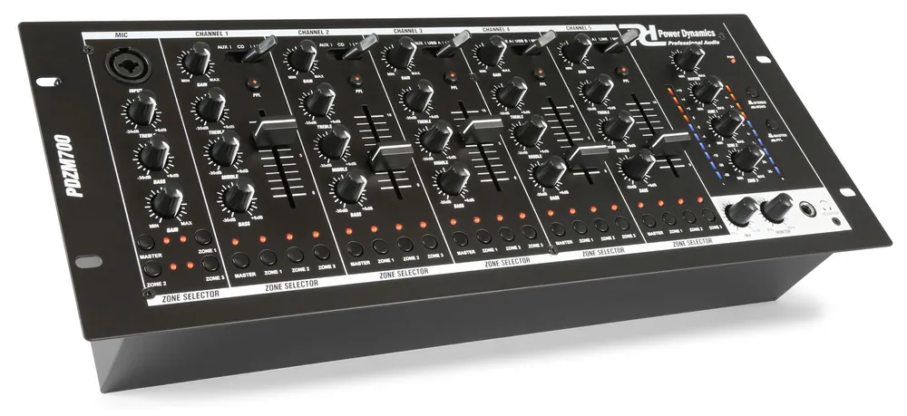 El PDZM700 es un mezclador de 6 canales con 4 zonas. El ecualizador de 3 bandas por canal asegura un sonido claro y calido. Cada uno de los 6 canales puede enrutarse a cualquiera de las 4 zonas de salida. La mezcla Cue permite escuchar la preescucha de canal y la salida de master en los auriculares. El canal especifico para micro y su ecualizacion permiten cualquier tipo de presentacion o karaoke. El PDZM700 es ideal para bares, clubs, restaurantes etc..
