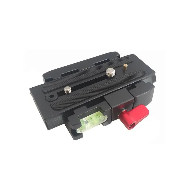 Zapata extraíble con base P20 para colocarse sobre trípode o monopie. Aleación de aluminio. Con bloqueo anticaída. Doble tornillo independiente de 1/4 y 3/8. Posee nivel de burbuja doble en el lateral de la base. 5x entradas de 1/4 y 2x de 3/8 en la base. Mango lateral de bloqueo en aluminio de color rojo.