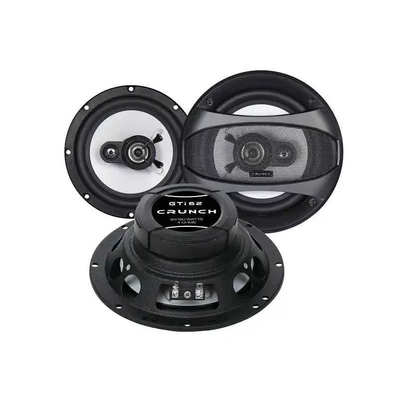El kit de altavoces coaxiales Crunch GTi 62 de 6.5″, 2 vías de la serie GTi soporta una potencia de 180 w, cuentan en su fabricación con una membrana del woofer en Polipropileno blanco, un robusto chasis de acero, el tweeter tiene una cúpula de Mylar junto a un imán de neodimio.