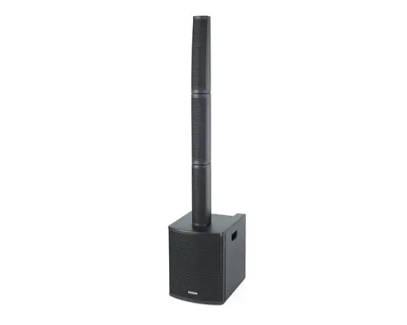 Este sistema activo de 700 w incluye un bub de 12″ un mezclador de 3 canales y 8 altavoces de 3,5″ montados en un array vertical que aporta una cobertura horizontal de 120º a 200º