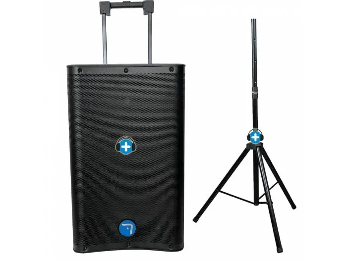 Pack compuesto de altavoz activo con bateria y soporte de altavoz.