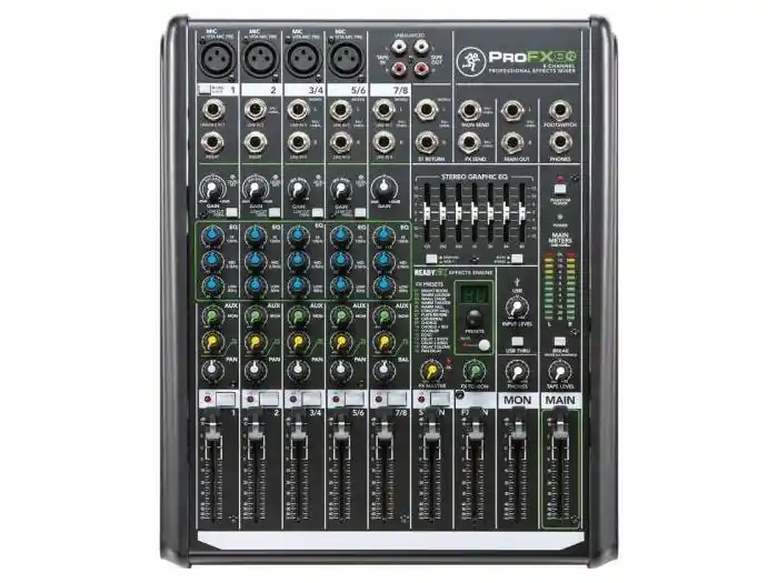La Mackie Pro FX8 v2 es una mesa de mezclas profesional de 8 canales con 4 previos de micrófono Mackie VITA Clase-A. Incorpora también un procesador digital de efectos con 16 efectos, ecualizador gráfico de 7 bandas e interfaz usb para conectar tu ordenador. La Mackie Pro FX8 v2 es ideal para pequeñas sonorizaciones profesionales o para estudio, ya que ofrece una gran calidad de sonido.