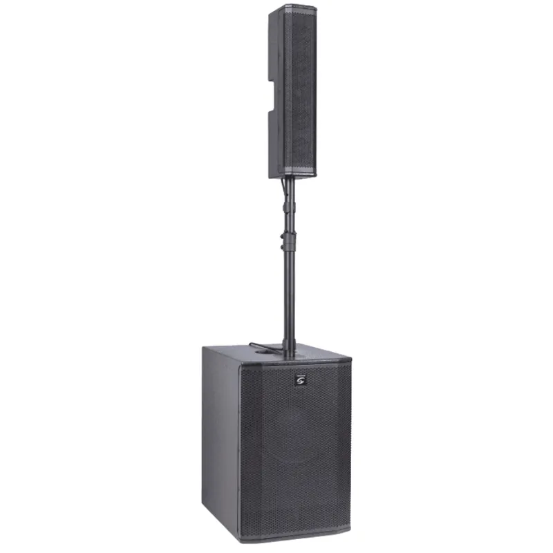 Todo el sistema se almacena dentro del subwoofer: columna, soporte, cables y bolsa. Su diseño modular facilita el transporte y el montaje, ideal para DJs móviles o eventos rápidos.