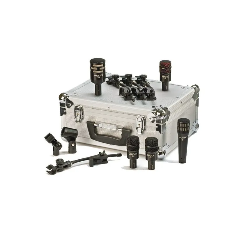 - ¿Qué incluye el kit Audix DP5A? El kit incluye cinco micrófonos (1 D6 para bombo, 1 i5 para caja, 2 D2 para toms y 1 D4 para floor tom), cuatro clips de montaje D-Vice y un estuche de aluminio para transporte y protección.