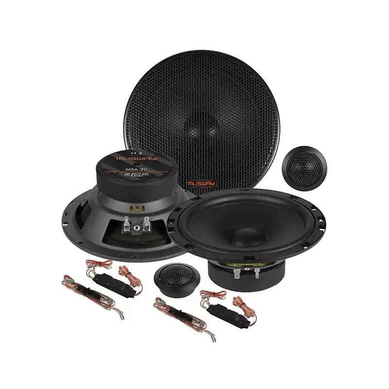 Los altavoces de 2 vías separadas de 6.5″ Musway MS6.2C son unos altavoces diseñados inteligentemente, con membranas de papel compuesto con una estructura de bambú que tienen una amortiguación muy alta, con una respuesta de frecuencia muy lineal, tienen un imán de ferrita y bobinas de voz ventiladas que garantizan una gran eficiencia y una potencia de 200 W. El tweeter con membrana de seda de 2.5 cm con imán de neodimio.