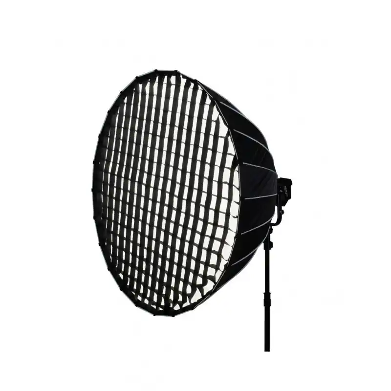 «Diseñado para adaptarse a la serie Evoke, este SoftBox parabólico produce una calidad de luz uniforme y suave. La rejilla incluida le permite reducir la amplitud del haz y controlar el ángulo, los difusores extraíbles ofrecen una suave calidad de luz. Interior plateado.