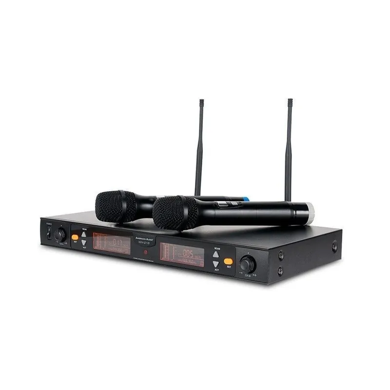 El American Audio WM-219 es un sistema de micrófono inalámbrico UHF de 2 canales que incluye dos micrófonos inalámbricos, dos anillos codificados por colores diferentes (para diferenciar cada micrófono) y un receptor inalámbrico con control de volumen individual y entrada de audio para cada micrófono.