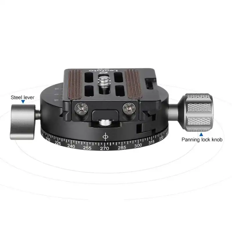 Cabezal panorámico RH-1L+NP-50 para rótulas de bola con plato extraíble. Esta de zapata intercambiable de Leofoto está realizada en aluminio aeronáutico ligero. Modelo de 52 mm de diámetro se engancha mediante tornillo incluido a las rótulas Leofoto series LH, NB, CB entre otras compatibles.