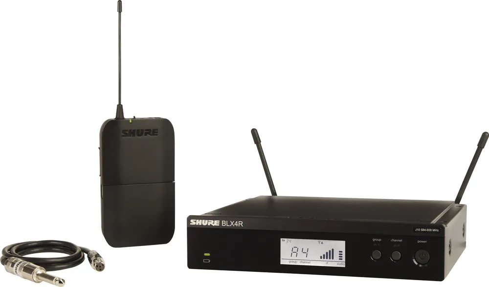 Sistema inalámbrico de petaca GUITAR SM de hasta 12 frecuencias compatibles, compuesto por receptor enracable BLX4R, emisor de petaca BLX1 y cable WA302.