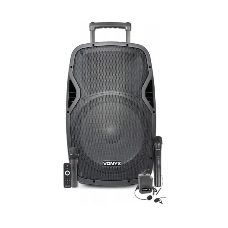 Bafle portátil PA profesional 15″ 800W con mando a distancia, puerto USB integrado y lector SD Card para reproducir ficheros MP3. Fabricado por Vonyx, a un muy buen precio.