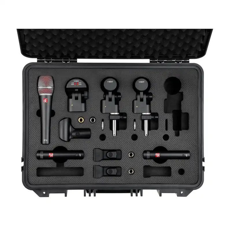 - Con este pack te llevas un micrófono dinámico de bombo V Kick, dos micrófonos dinámicos V Beat con sus correspondientes abrazaderas V para colocar sobre los aros de los timbales, un micrófono de instrumento dinámico supercardioide V7 X para caja y un par de micrófonos de condensador de diafragma pequeño sE7 para ambientes generales y platos.