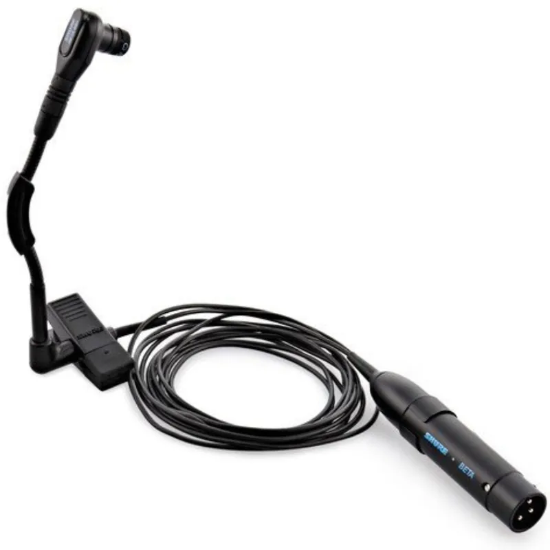 Su diseño compacto y ligero, junto con su cuello de cisne flexible, permite un ajuste preciso para obtener la mejor captación del instrumento. Además, su sistema de sujeción con pinza facilita su colocación en saxofones, trompetas, trombones y en el borde de tambores y timbales, asegurando estabilidad durante la interpretación.