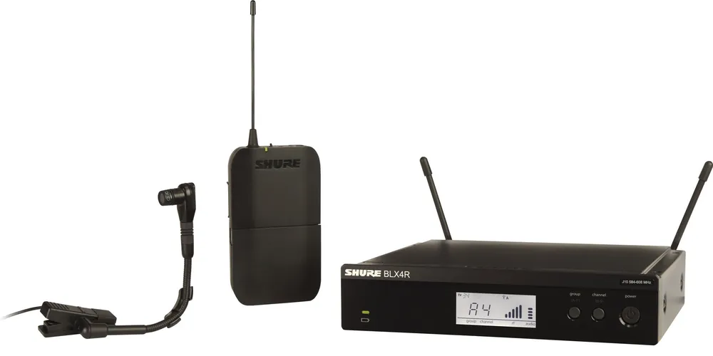 Sistema inalámbrico de petaca INSTRUMENT BETA de hasta 12 frecuencias compatibles, compuesto por receptor enracable BLX4R y emisor de petaca BLX1 con micrófono WB98H/C.