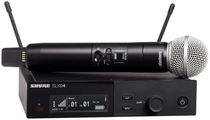 Los sistemas SLX-D son compatibles con el software Wireless Workbench® y la app ShurePlus Channels para celular, que permiten monitorear los datos importantes y controlar los sistemas en tiempo real. Cada sistema incluye un receptor dual SLXD4D, dos transmisores de mano SLXD2/SM58, antena, accesorios de montaje en rack y 4 baterías AA.